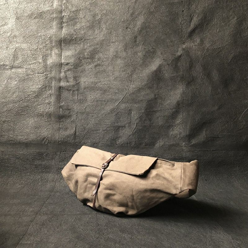 斜めに背負うとぴったりフィットするボディバッグ小。蓋と本体を革のストラップで留めてアクセントとしました。 サイズ:W480×H220×D120