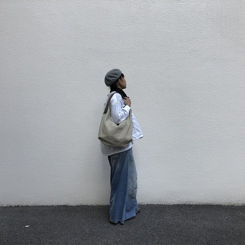 丸みを帯びた大きなデザインに、幅太の革ショルダーが付いた存在感抜群のバッグです。帆布と相性のいい革を使用し、使っていく程に肩に馴染みます。 サイズ:W520×H380×D200 (内ポケット200×200付)