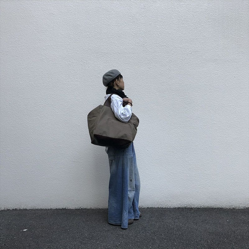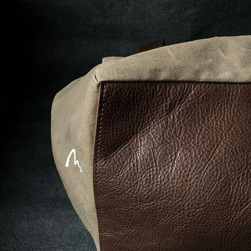 取っ手や底に革をふんだんに使用した、大容量バッグ。入り口は布を重ね、中が見えない様になっており、内側には大きなポケットを完備しております。マチ幅のたゆみが特徴的なデザインとなり、一目を惹きます。旅行に行かれる方にもお進めです。 サイズ:W370×H370×D240(持ち手含まず)