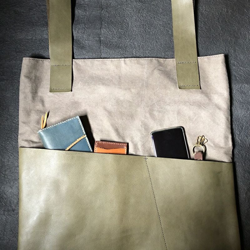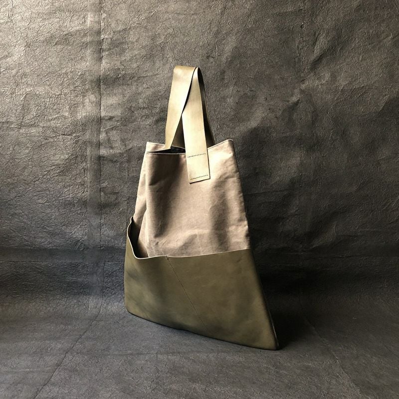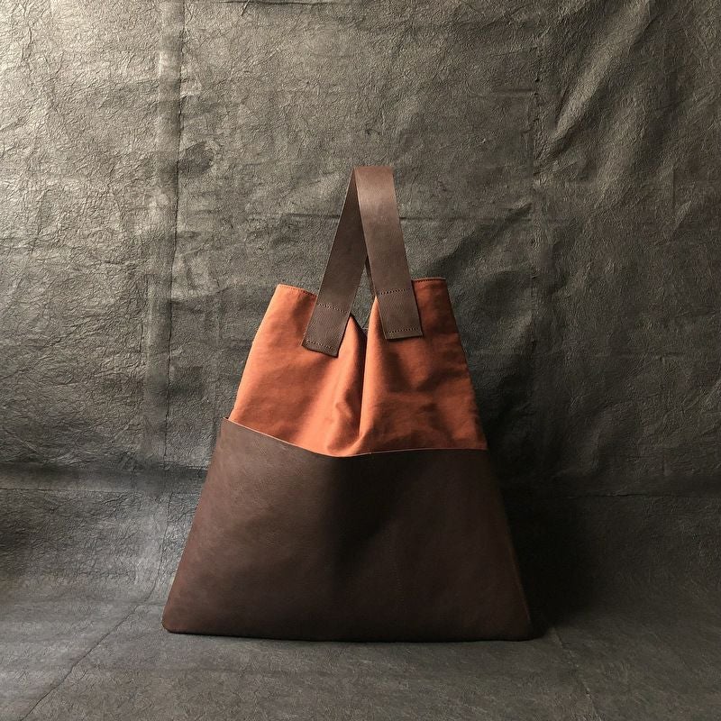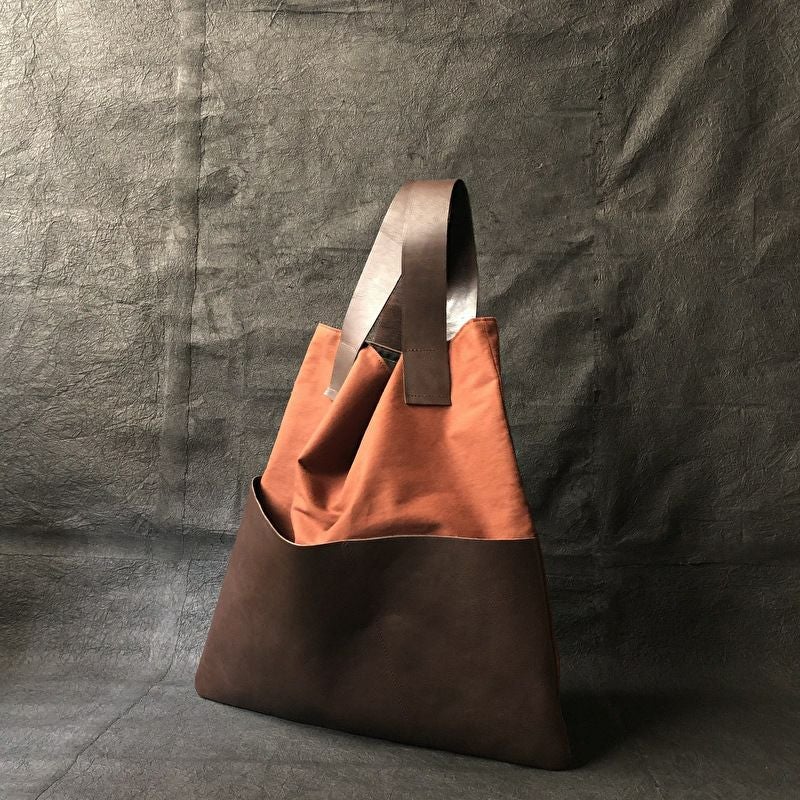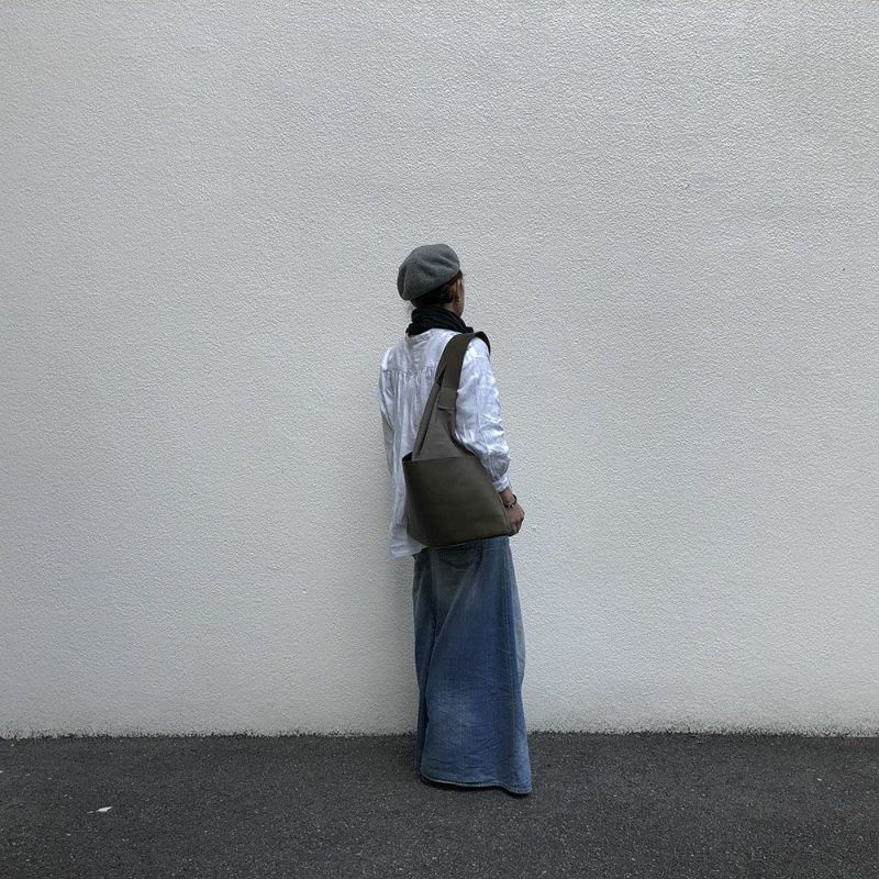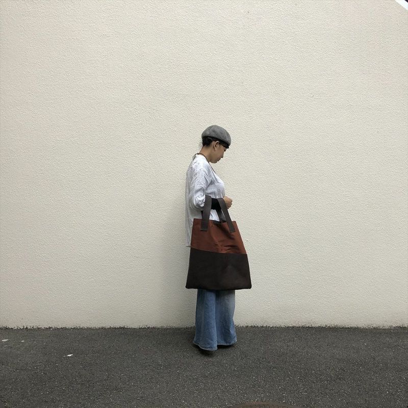 ショルダーの取り付け方に拘ったズタブクロ。外側には大胆に大きな革ポケットが付き、くたっとしたシルエットは、肩にかけたときの変形が面白い仕上がりとなりました。内側にポケット付きです。 サイズ:W480×H480×D3