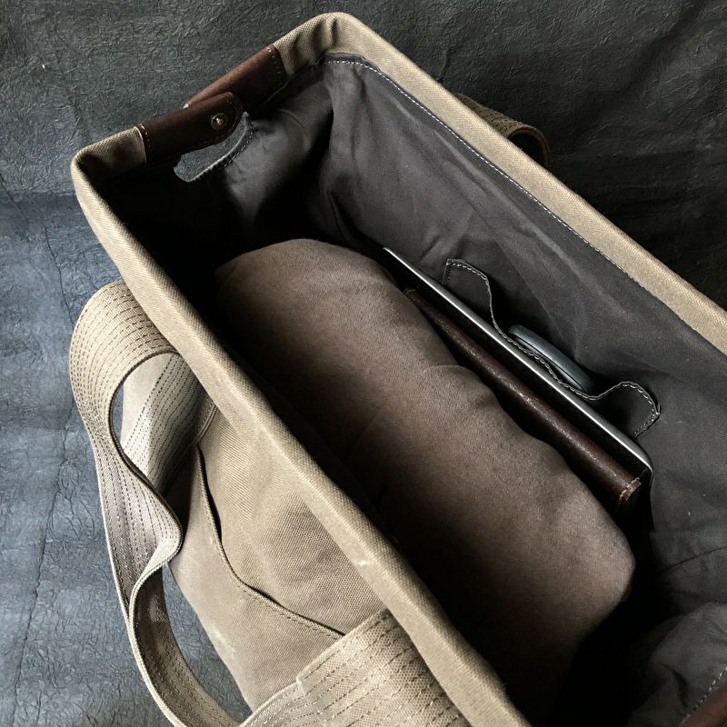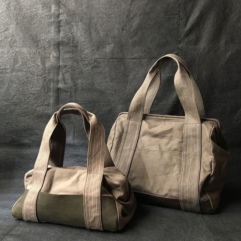 大きなマチが特徴的な大容量バッグ。 ちょっとした旅行のお供にぜひどうぞ。