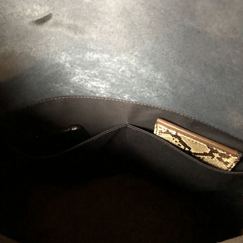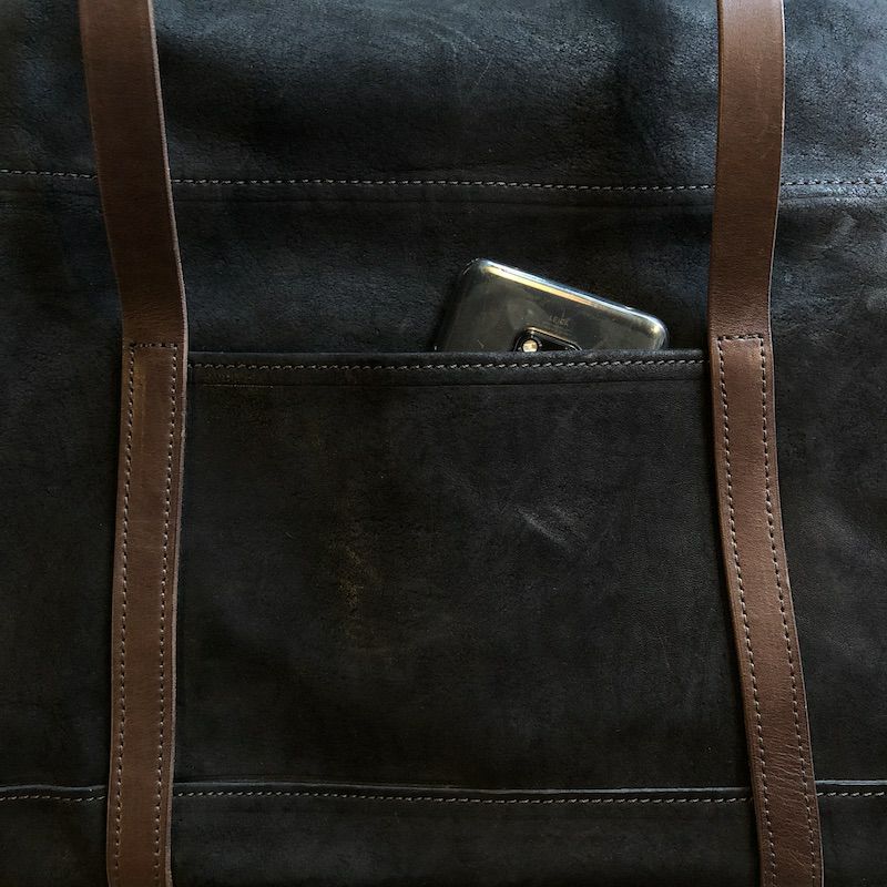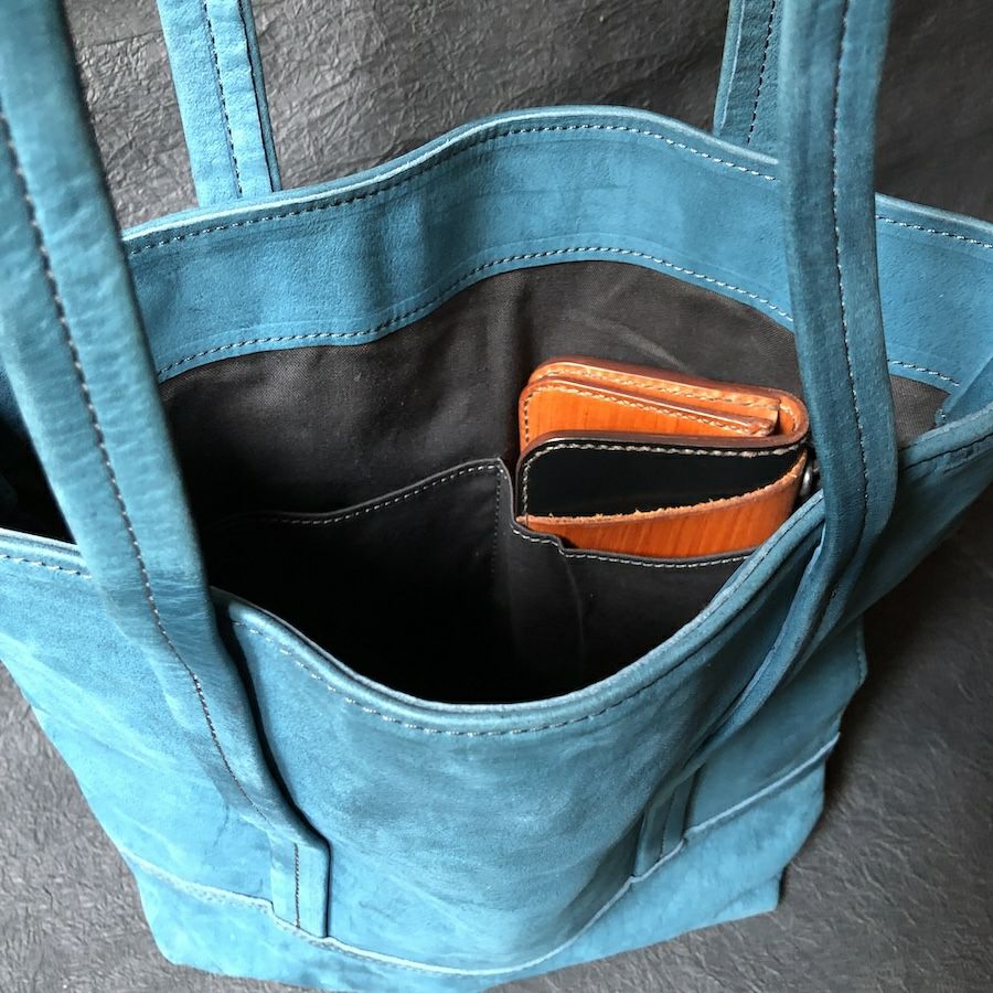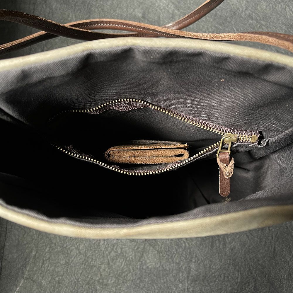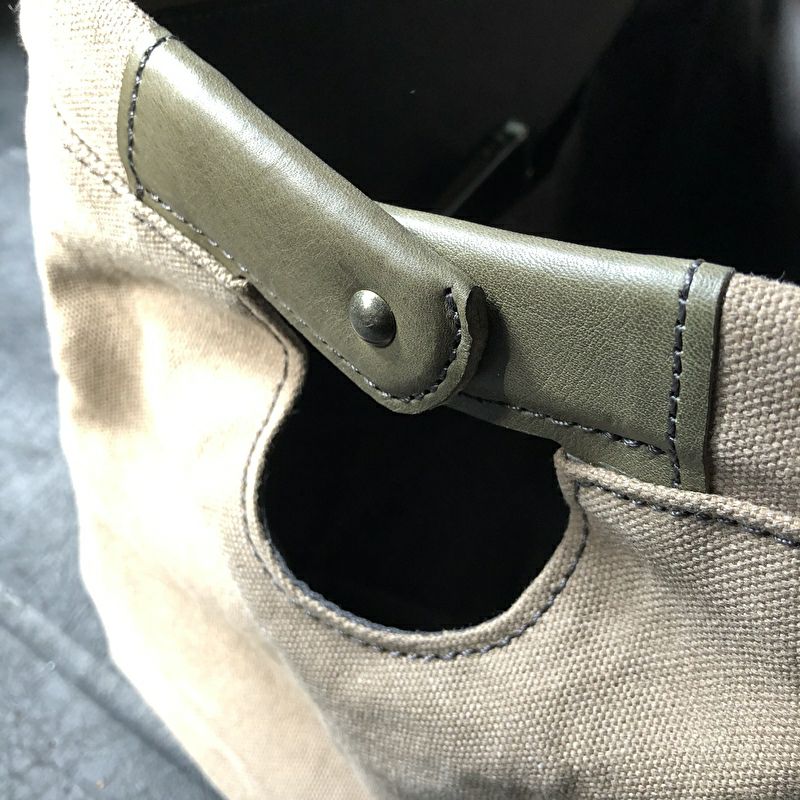 取っ手や底に革をふんだんに使用した大容量バッグです。