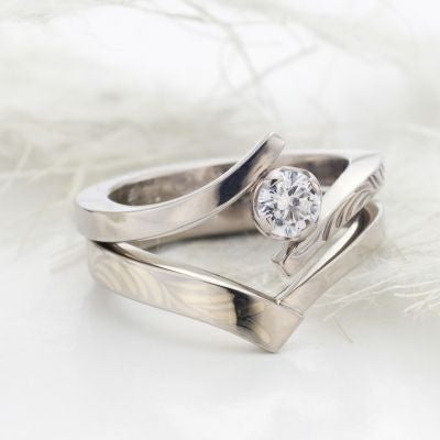 (上)伝統ある唐草文様を流れが美しく見える様彫り入れました。繊細なアームと大粒のダイアとのバランスが美しいエンゲージリングです。