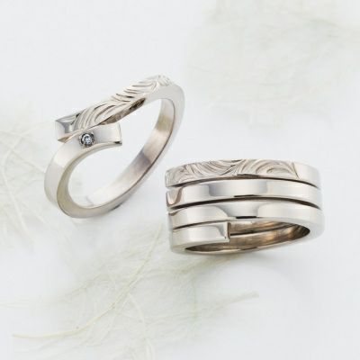 ストレートなアームに曲線を交え、中央にかわいらしくダイアをポイントに置きました。さりげない唐草模様もシンプルながらしっかりと存在感を成してくれます。