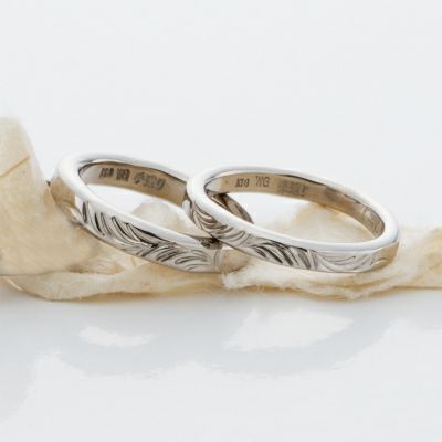 (左)丸線を手で叩いて形状を形成し、ゆらゆらとゆれる輪郭が優しい印象のリングです。手捻りの陶器のような温かみがあり、指馴染みも抜群です。アクセントに唐草模様を施しております。