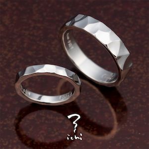(左)人気の鎚目リングの側面をフラットにお仕立てしました。手で打ち込む柔らかさと、シャープな印象が調和するリングです。キリッとした印象に、打ち込まれた角度が輝きを放ち、すっきりしたデザインとなります。
