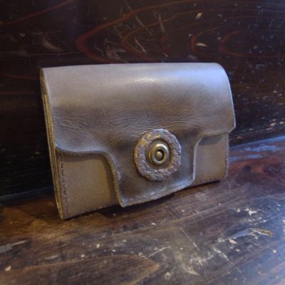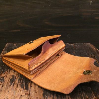 朽加工された革に腐食した真鍮金具を配しました。 見た目のインパクトに加え、小銭入れの形状や幅を広くとったカード入れ等使い勝手にも拘りました。 革の濃淡の違いと共に質感の違いも必見。使い込むほどに深まる豊かな艶も魅力です。