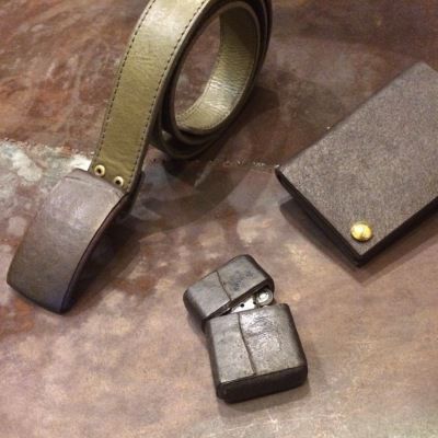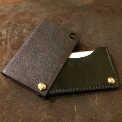 蝶番が外の煉革が内のろう引きを繋ぐ開閉式のカードケースです。 留め具の役割を持つ真鍮ボタンがアクセントに。 煉革:革を膠(にかわ)水につけ、鎚で打ち付け薄くのばし これを数枚重ねて板にしたてた革。