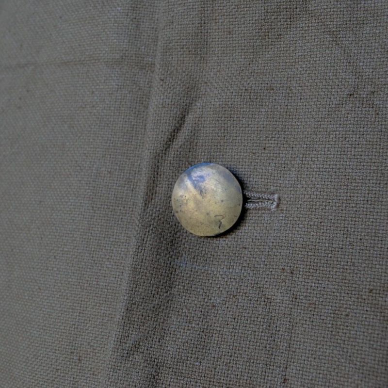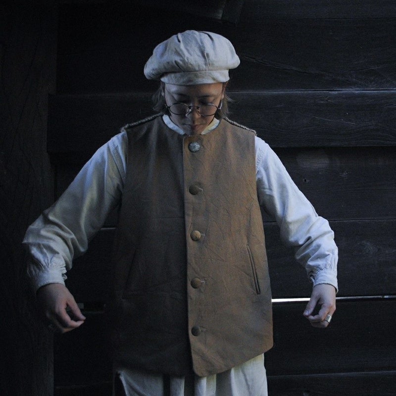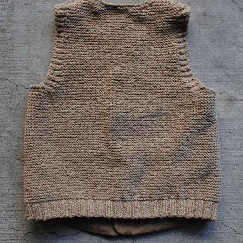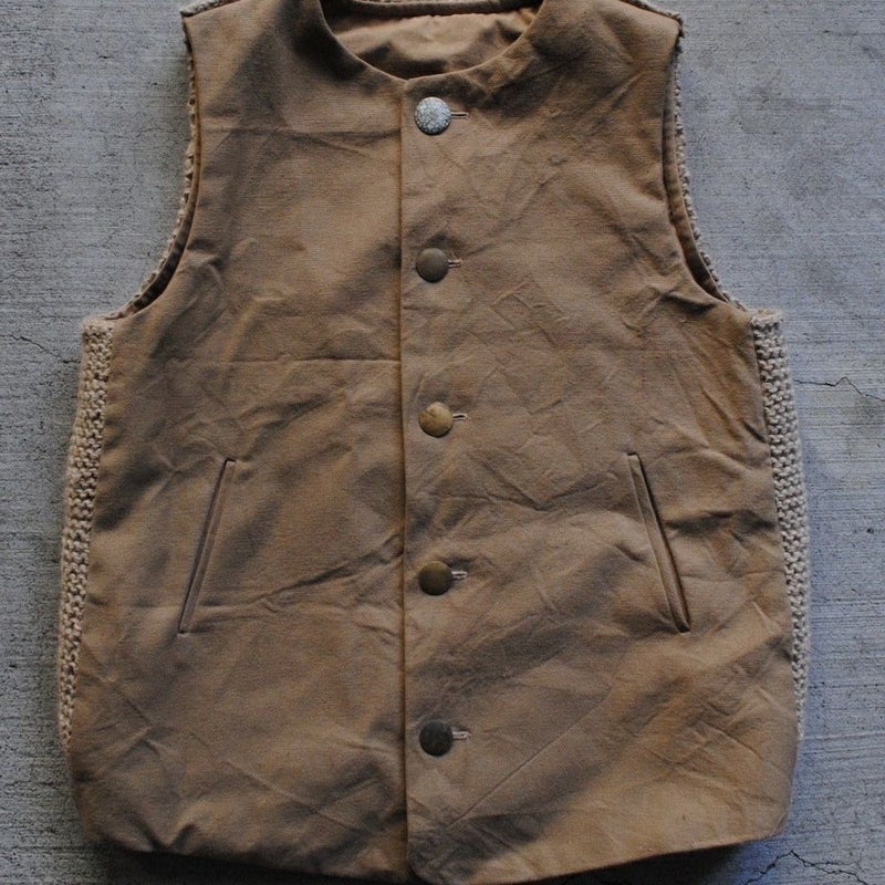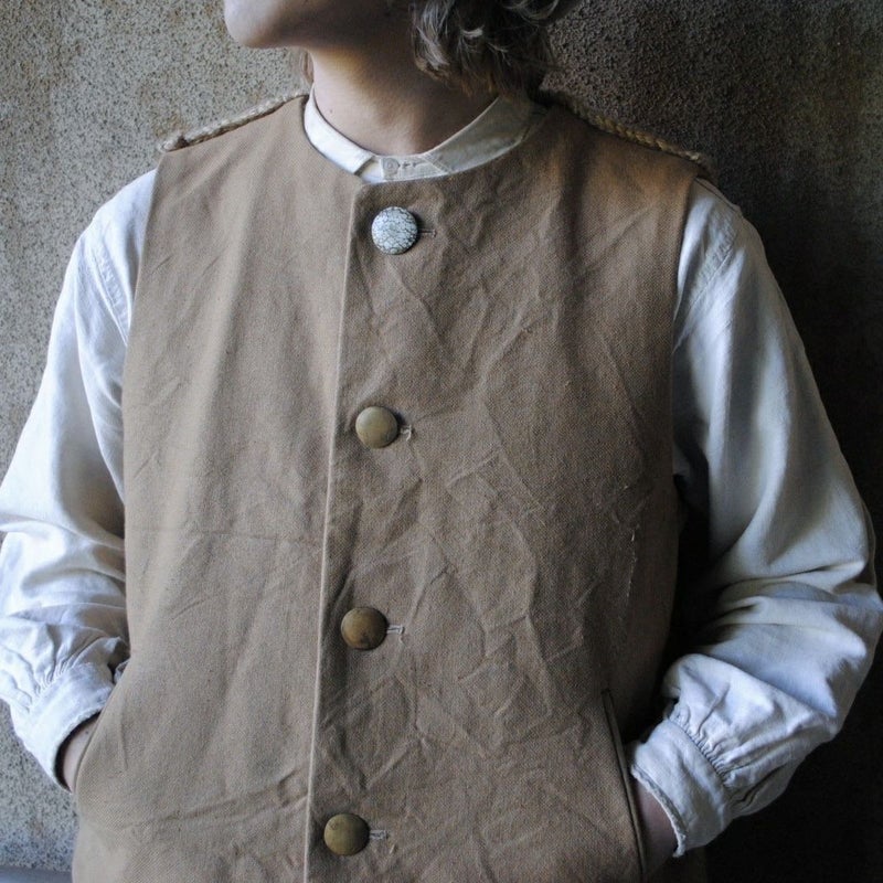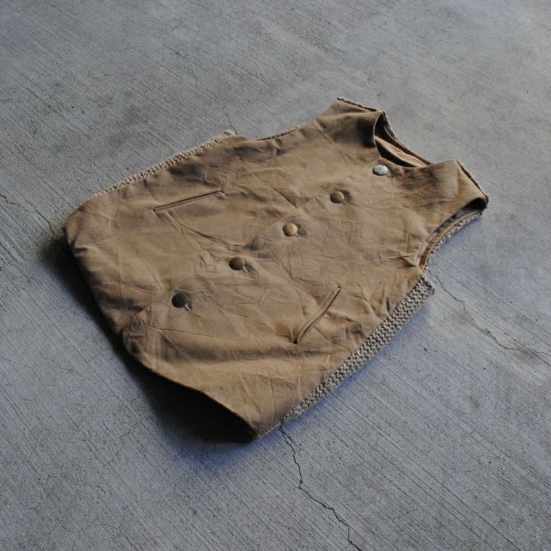 品種改良されていないコットン本来の色を生地にした「ブラウンコットン」を使用したベスト。ボタンには無垢の真鍮と卵殻漆を。背面の手編みのニットにも素材本来の色を追求。
