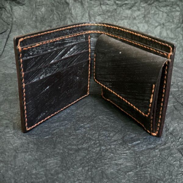 シンプルさに拘った二つ折り財布です。シンプルな中に外側の帯が映えるデザインとなっています。形より革の変化を楽しむことに目が惹きます。