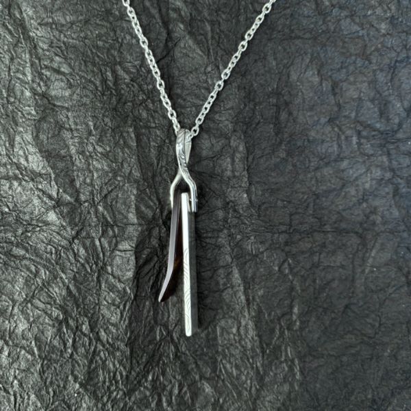 細長い鼈甲がゆらゆら揺れる、繊細な印象のペンダントトップです。唐草を施したsilverのバーと、細長い鼈甲がゆらゆら揺れる、繊細な印象のペンダントトップです。鼈甲特有の色味があたたかく、細身のシルエットなので、女性にもオススメのデザインになっています。