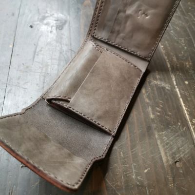 タンニン鞣しの牛革に柿渋染めを施した藍染め三つ折りウォレット
