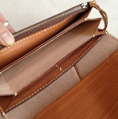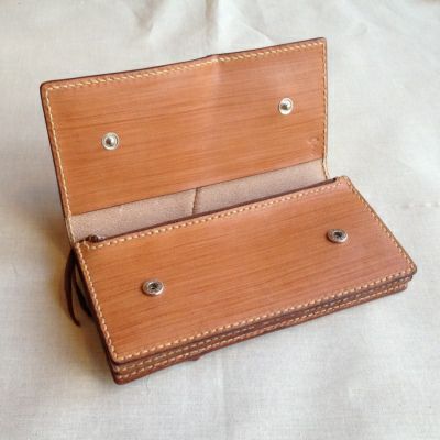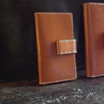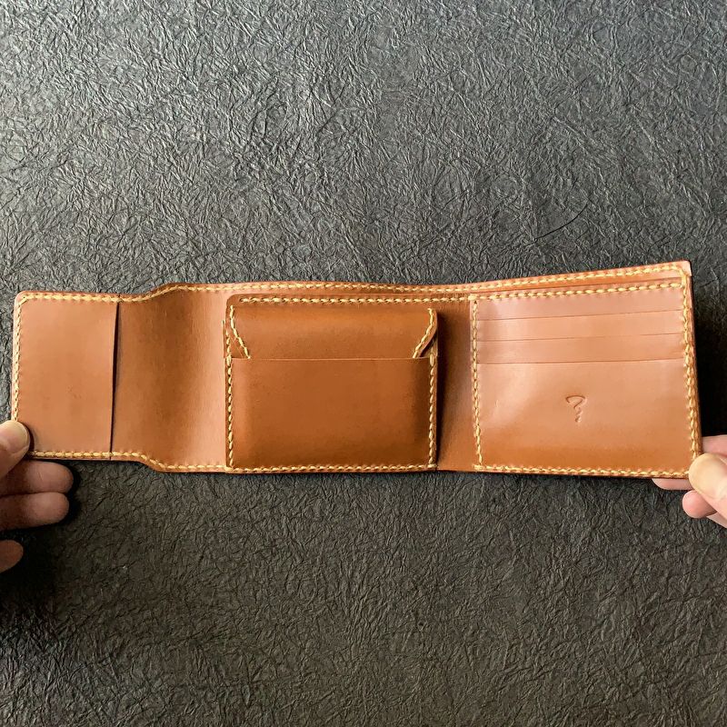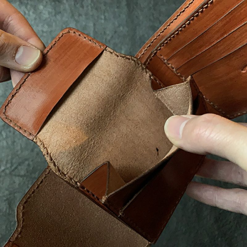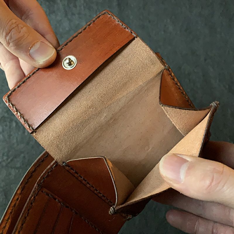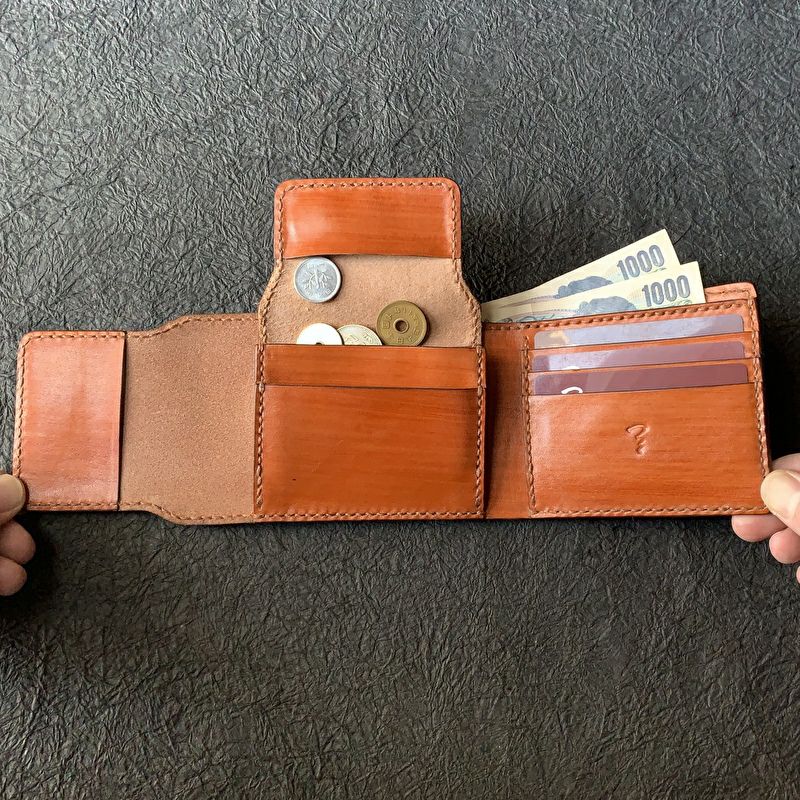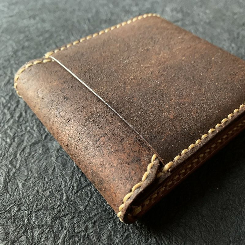 タンニン鞣しの牛革に柿渋染めを施した三つ折りウォレット