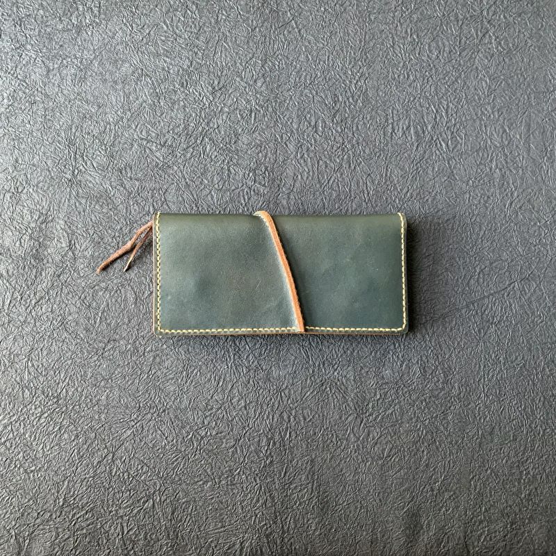 タンニン鞣しの牛革に柿渋染めを施した藍染め三つ折りウォレット