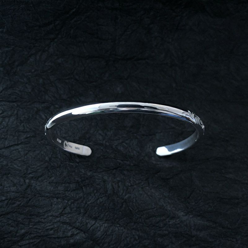 甲丸に彫り込まれた唐草と、両端の鏡面とのコントラストが美しいバングルです。
