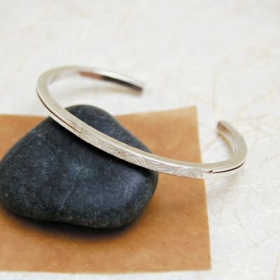 中央から少しずらしたところに唐草をあしらった細めのバングル。漆のラインによってスッキリとした印象を与え、重ね着けにも向いています。漆の色によって印象が異なるので、お好みの漆をお選び下さい。
