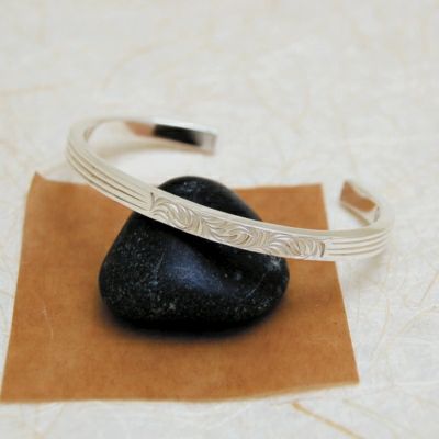 中央から少しずらしたところに彫り込まれた唐草と、両端から伸びる3本のラインが、手首のアクセントになる平角線のバングルです。