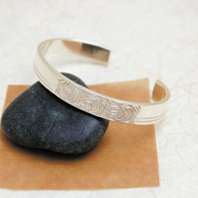 中央から少しずらして彫り込んだ唐草と、下部に入ったラインとのバランスが、持ち手のこだわりを光らせる、平角線のバングルです。