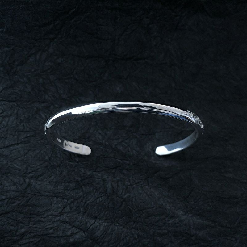 丸みのある甲丸線は手首に馴染みやすく、両端に彫り込まれた唐草と、鏡面とのコントラストが美しいバングルです。