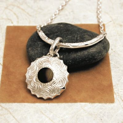 中央にあしらわれた円形の鼈甲と、ギザギザしたシルエットが特徴的なペンダントトップです。