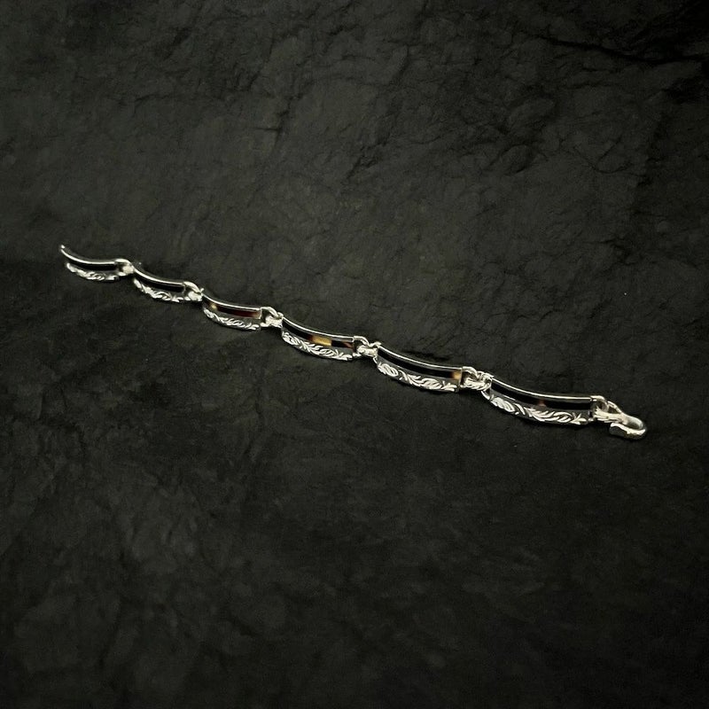 唐草が彫り込まれ、鼈甲を合わせたプレートは、ゆるくカーブがついており手首にフィットします。全てのパーツに彫り込まれた唐草の美しさと、鼈甲の奥深い輝きが存在感抜群、贅沢な印象のブレスレットです。