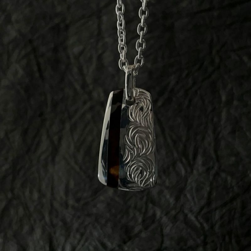 大胆に彫り込まれた唐草の華やかさと、全体を引き締める幅広の鼈甲が存在感抜群で、贅沢な印象のペンダントトップです。やや沿った形状のため立体感があり、首元のアクセントになるデザインです。