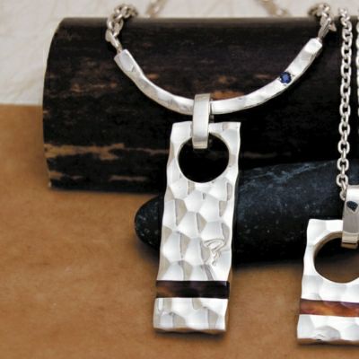 大きく空いた穴が印象的なペンダントトップです。下部に施されたライン状の鼈甲には、全体に打ち込まれた鎚目に合わせて凹凸が付けられており、職人のこだわりが光る一品。鎚目の面が生み出す輝きと、鼈甲特有の奥深い輝きのコントラストが楽しめるデザインです。