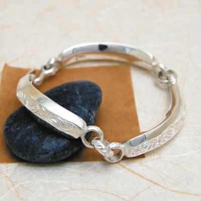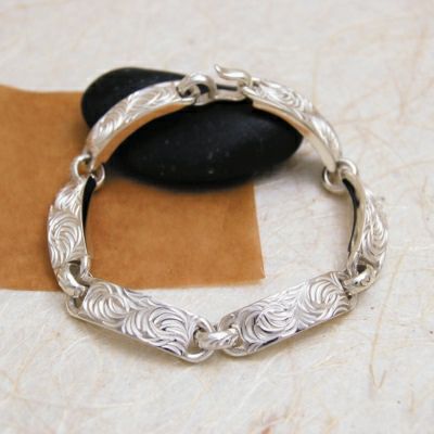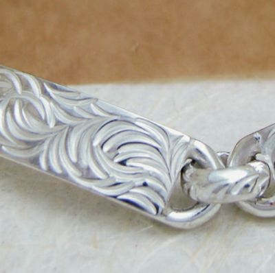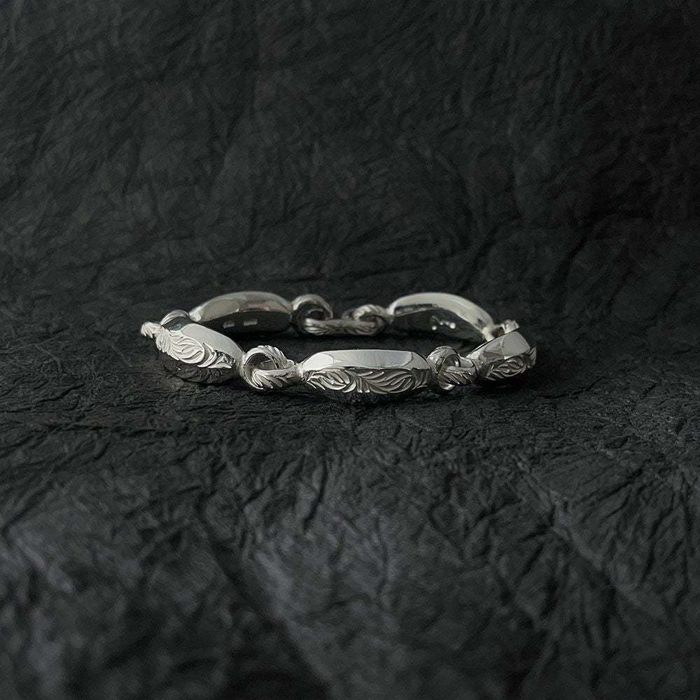純銀を繰り返し叩き出来上がった表面、細部に唐草を彫った、スマートなブレスです。