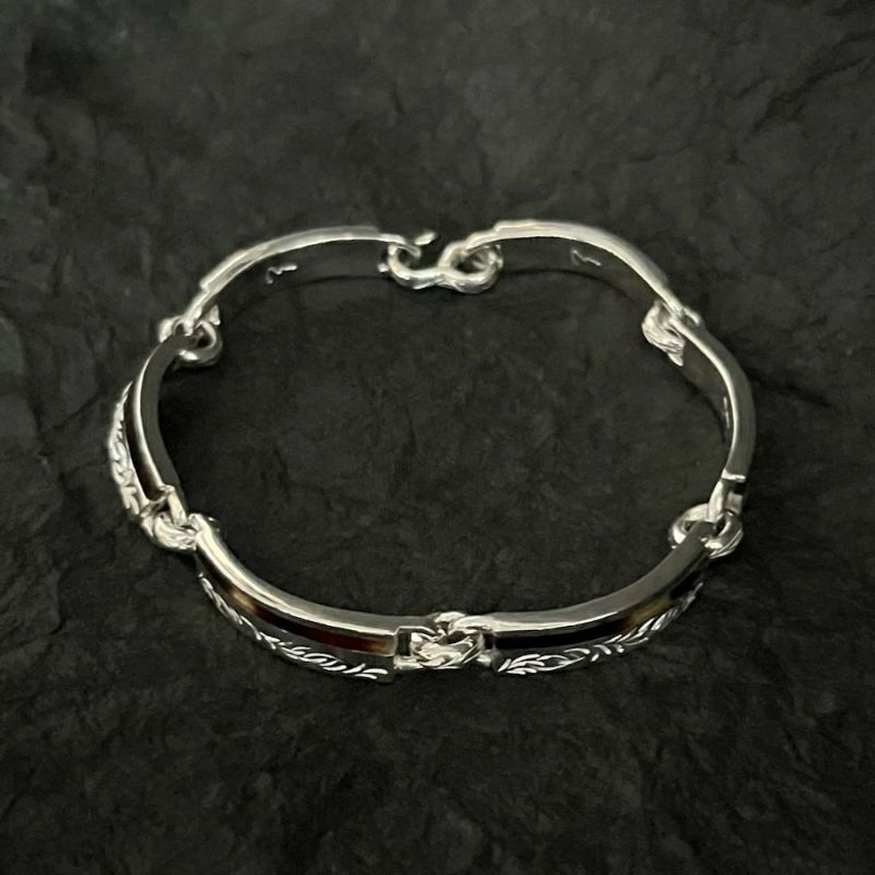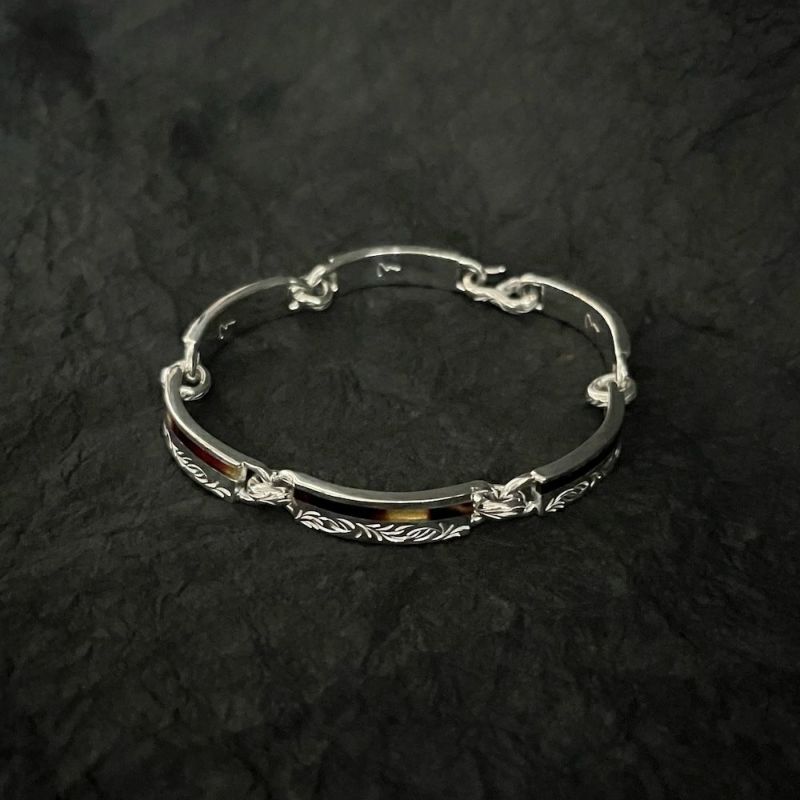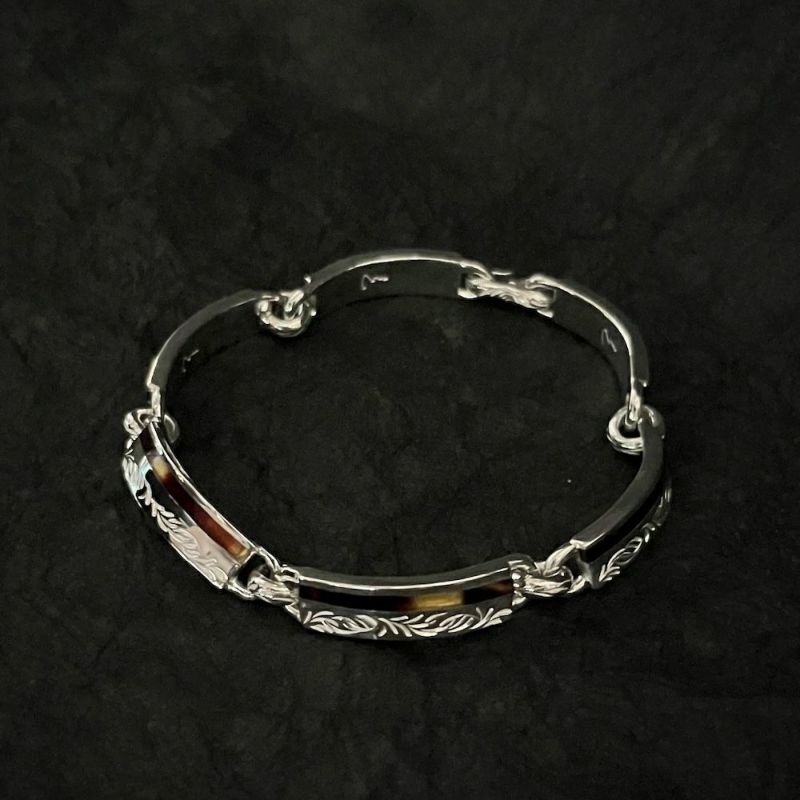 唐草が彫り込まれ、鼈甲を合わせたプレートは、ゆるくカーブがついており手首にフィットします。全てのパーツに彫り込まれた唐草の美しさと、鼈甲の奥深い輝きが存在感抜群、贅沢な印象のブレスレットです。