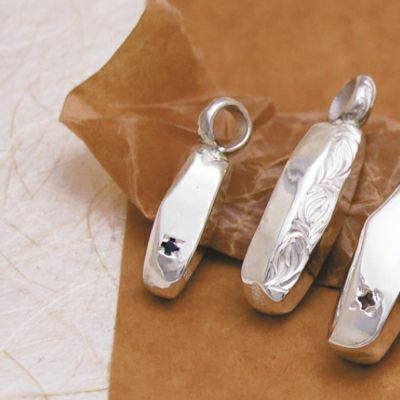 鍛造ならではの叩きを何度も加え、形を作り上げた純銀のトップです。造り手によって変わる僅かな表情の違いもまた面白いデザインです。プレーンに石がアクセントとなるものや、唐草の彫りが施される事でガラリと印象が変わるものなど、お好きなデザインをお選び下さい。