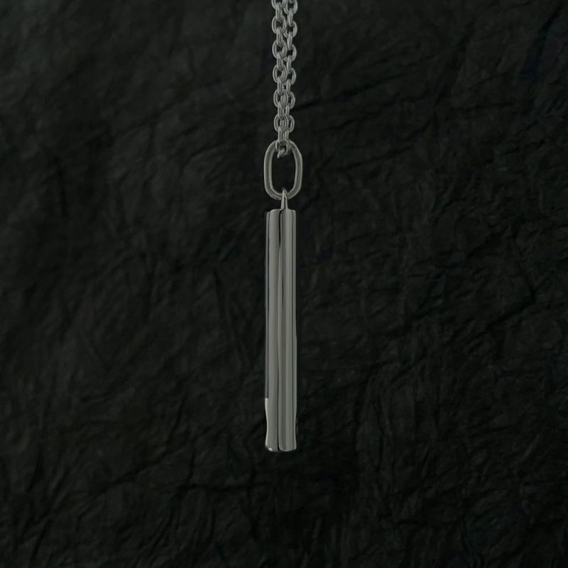 円柱形のバーに彫り込んだ唐草と、ライン状の鼈甲が印象的なペンダントトップです。さりげない鼈甲特有の色味と、屋号部分の凹んだ形状がアクセントになっています。