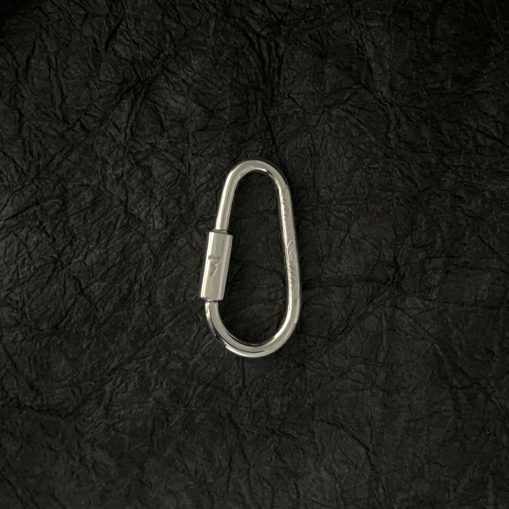 丸い線材の側面に彫り込まれた唐草。こだわりの光るネジ式キーリングです。