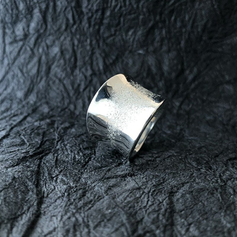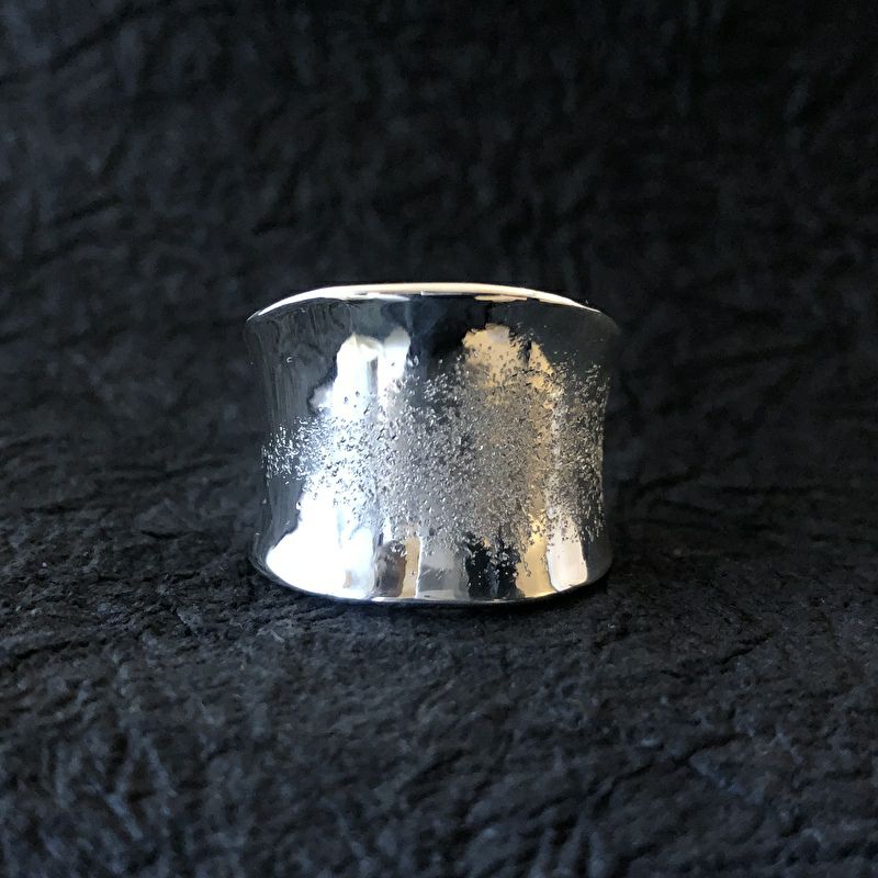 幅広ながら個性的なデザインと、細かく入った梨地により、抜群の存在感。めくり上がった様なデザインも技が光ります。