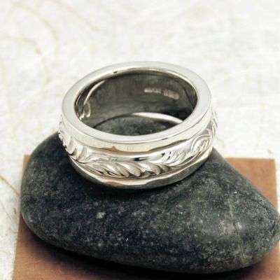 中央の唐草リングが回転するリング。一回り大きめな中央の唐草リングがしっかり主張してくれる、個性派リングです。