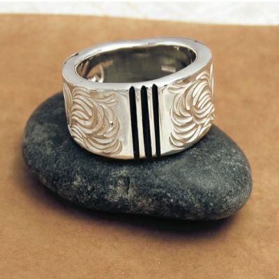 漆の入った3本のラインがアクセントの幅広リング。幅の細い背面からラインに向かって唐草模様がダイナミックに彫りあげられています。