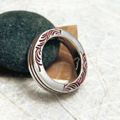側面に唐草模様の彫りが施され、正面には2本のライン。絶妙なバランスのデザインで、側面が主役となるリングです。鹿紐をつけてネックレスtopとしても。
