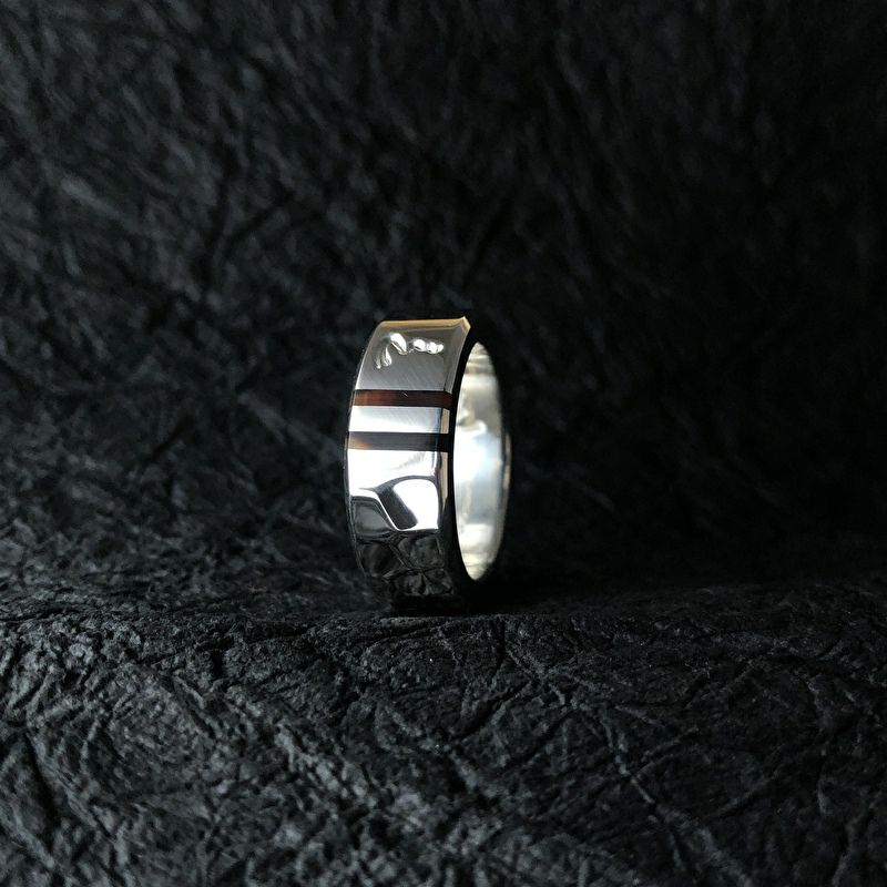 一つ一つ打ち出された鎚目のキラキラとした表情と、鏡面の艶やかな表情、2本の鼈甲の奥深い輝きが美しいリングです。