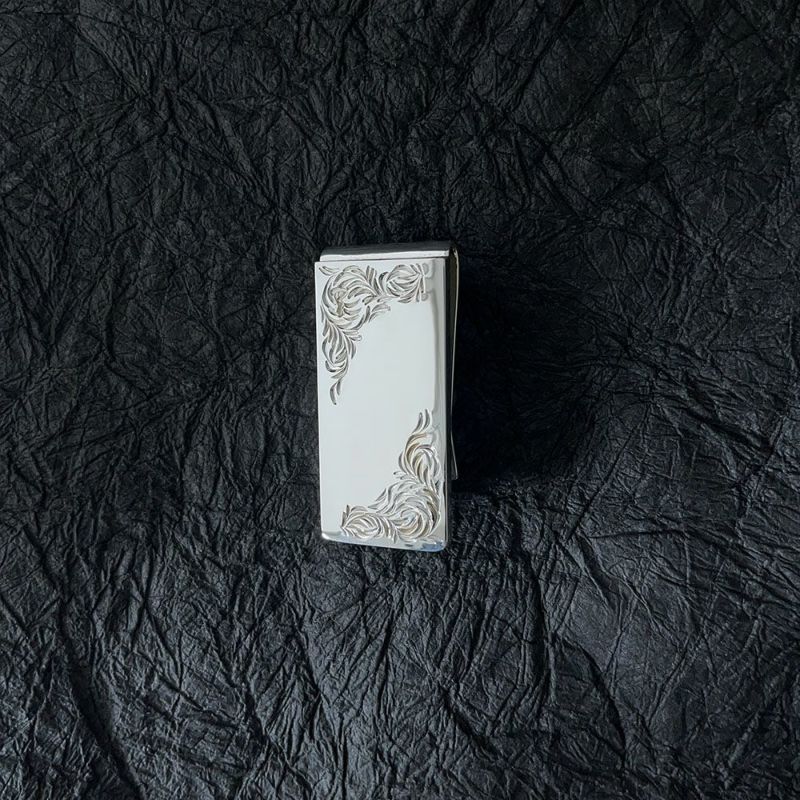 対角に施された唐草と、それにより引き立てられる鏡面が印象的な、やや幅の広いタイプのマネークリップです。