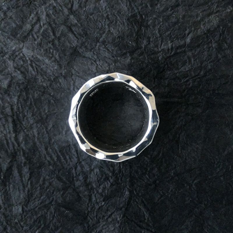無骨な幅広ボディで、金槌で打たれた鎚目が美しく光るリング。