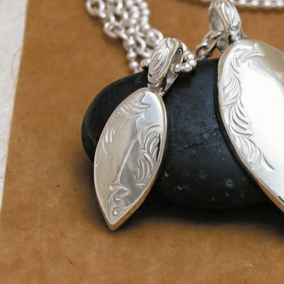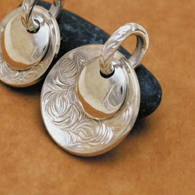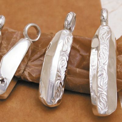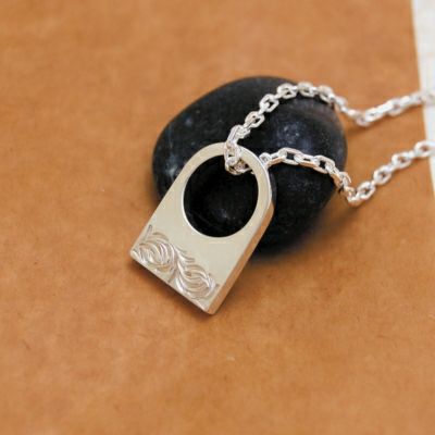 長細い楕円形のプレートに、唐草と鼈甲のラインを施したペンダントトップです。