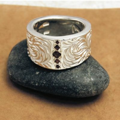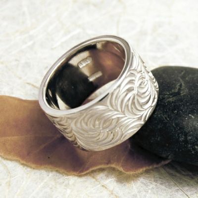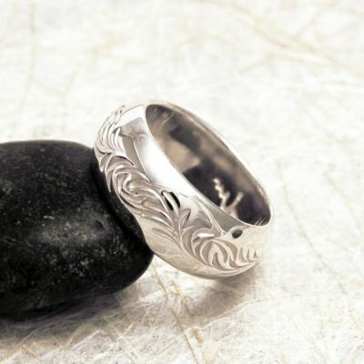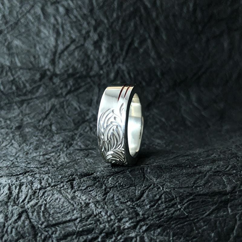 幅広の甲丸リングに堂々とした唐草を彫り込んだリング。