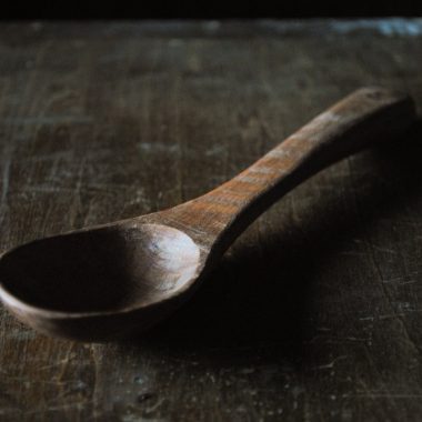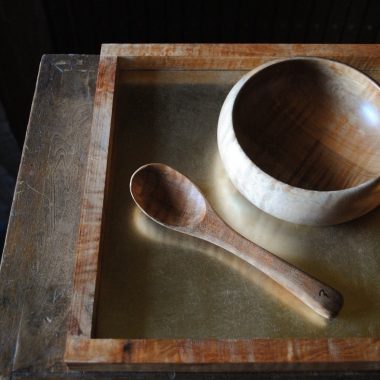 この暖かな木製食器を真鍮トレーにのせての完全ひとり飯セットとしました。
